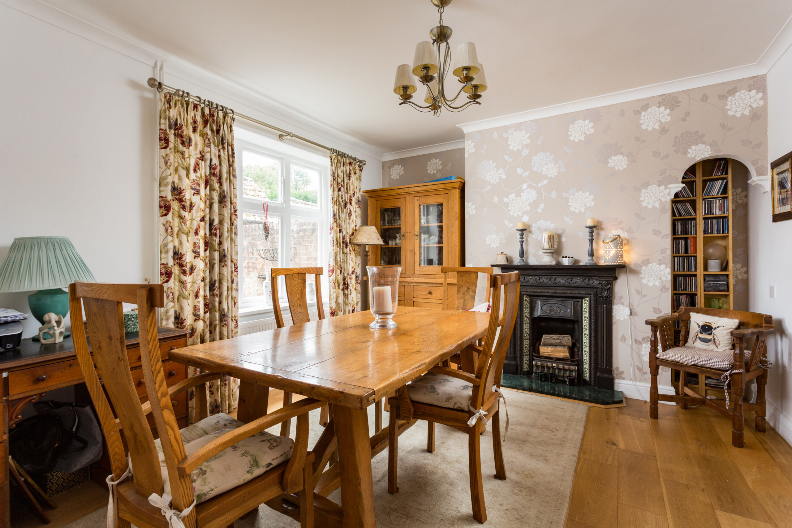 Internally, the property opens to an entrance hall with all rooms leading off including a cosy lounge with bay window and fireplace. French doors lead to a formal dining room with Oak flooring and period fireplace.