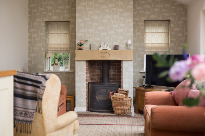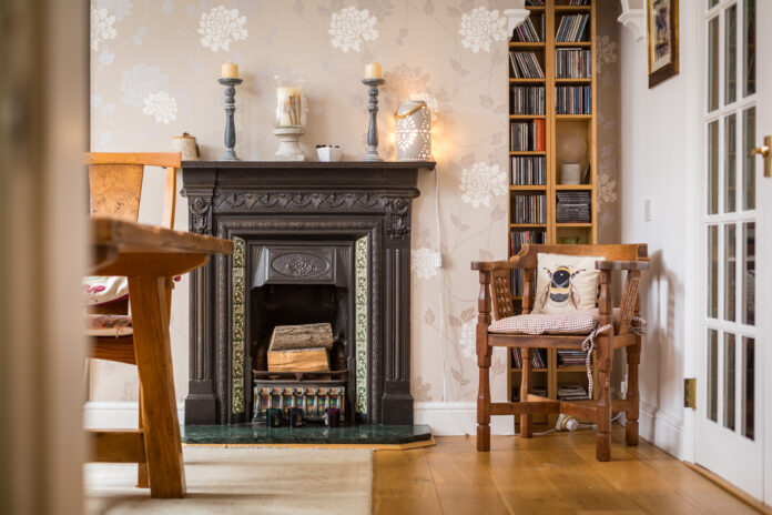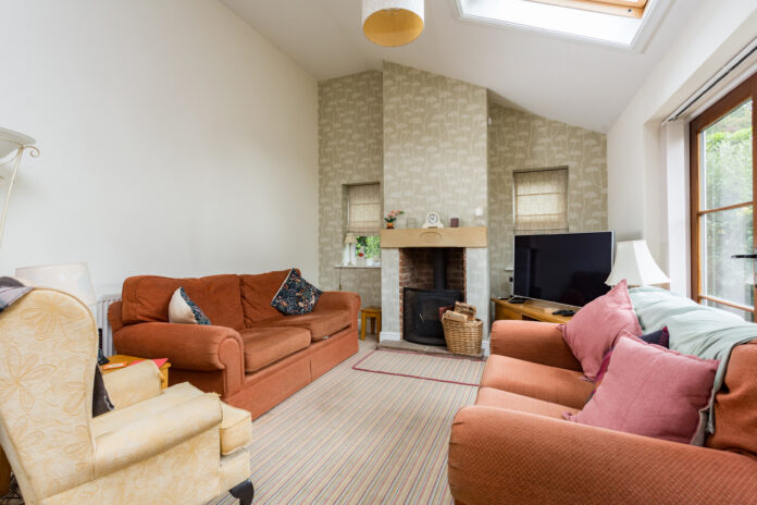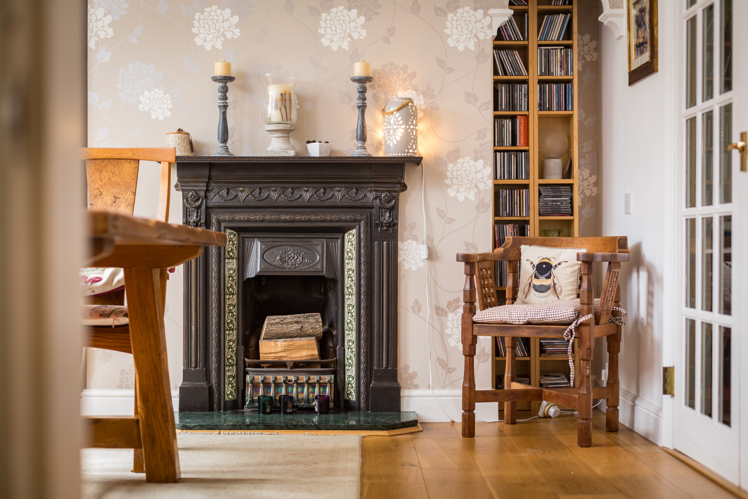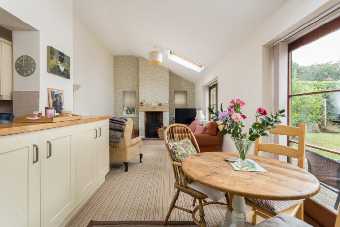 The centrepiece of the house is the impressive kitchen and garden room with vaulted ceiling and central fireplace with log burning stove. This well designed versatile space is flooded with natural light via dual French doors and Velux skylights, and provides a lounge plus casual dining area.