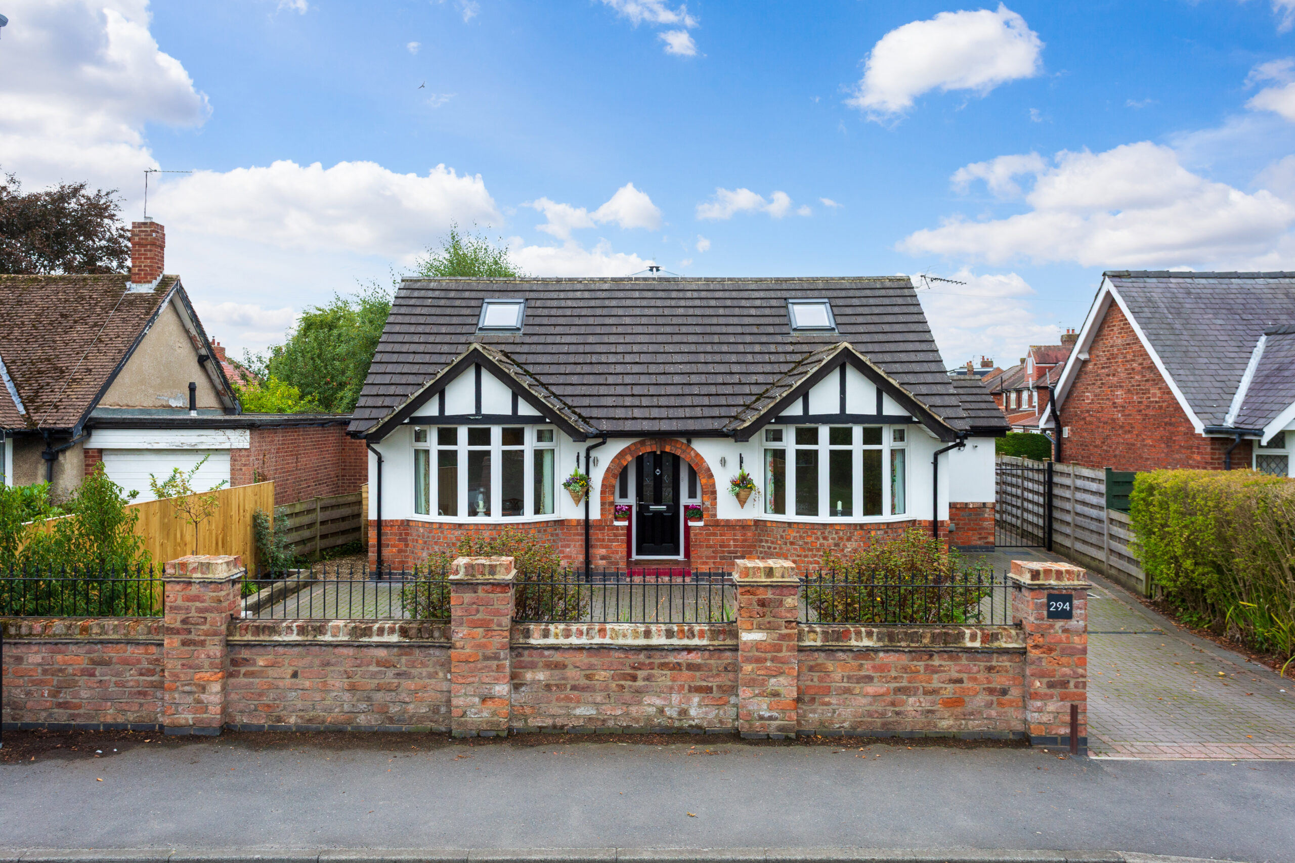 Externally, to the front is a large driveway offering parking for approximately four vehicles beyond a dwarf wall with wrought iron railings.